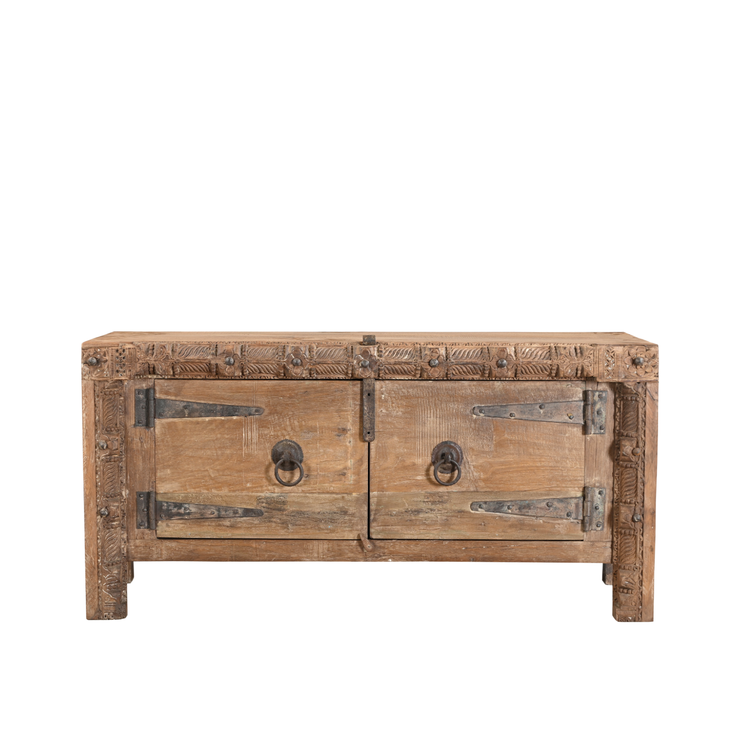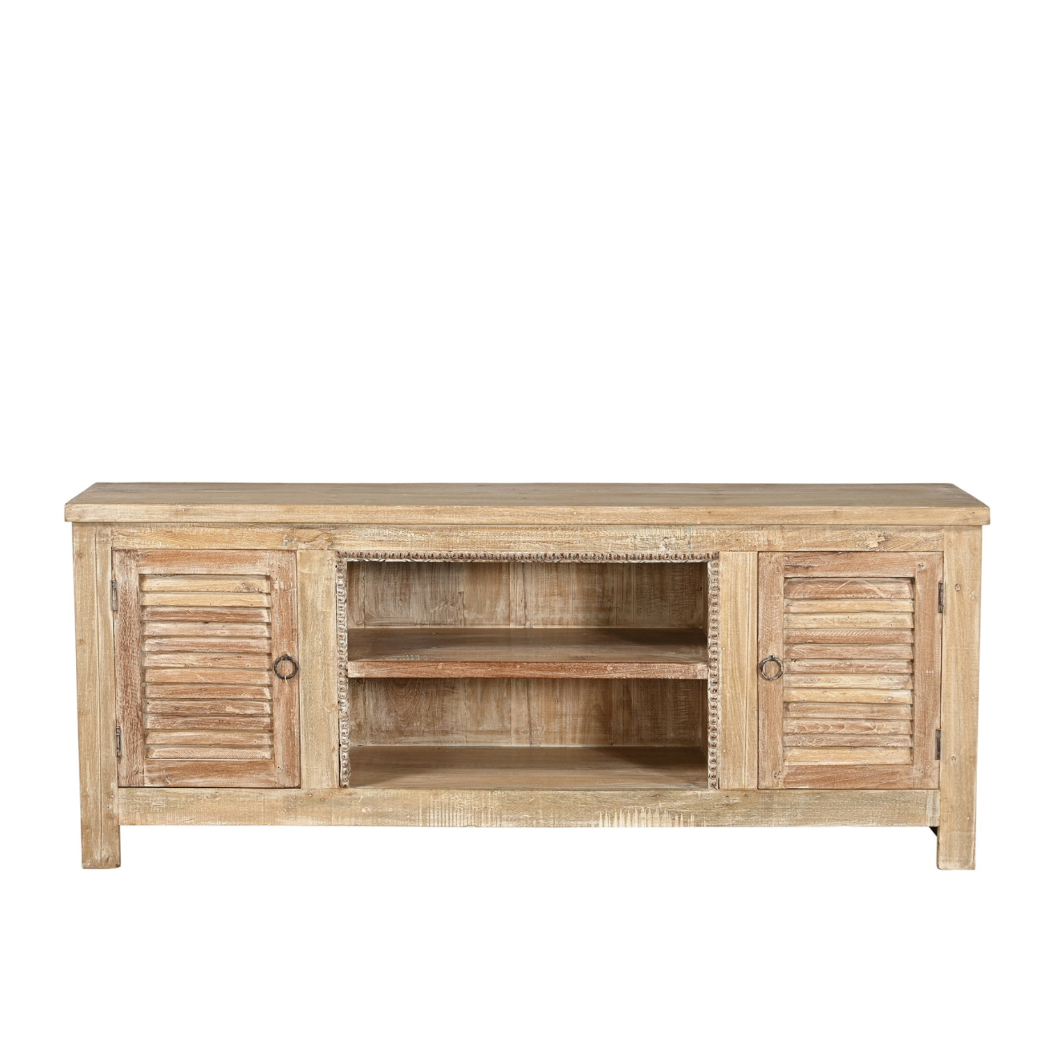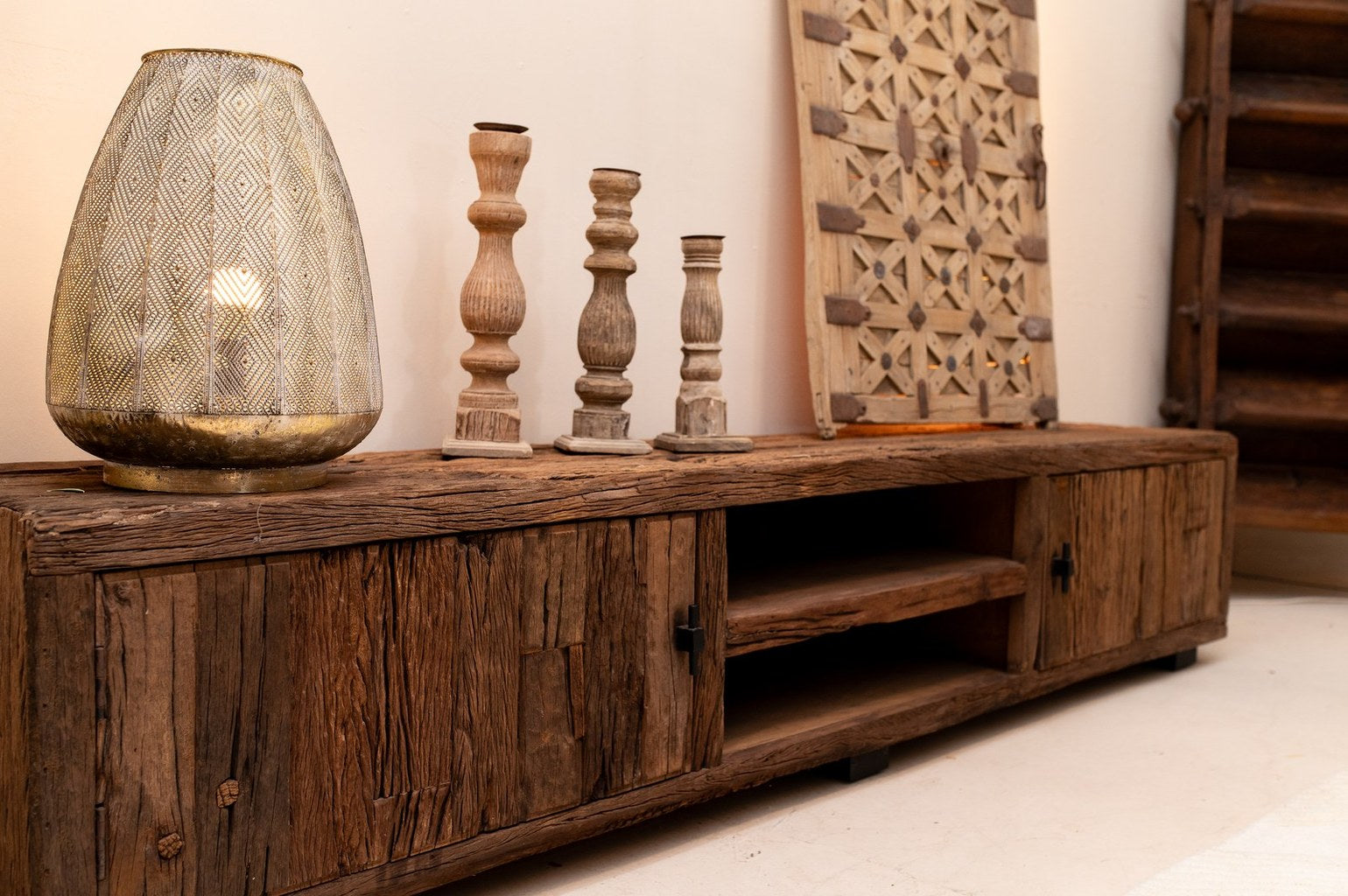 Le secret de nos meubles télé réside dans son matériau d’exception : le teck massif recyclé. Issu d’anciennes bâtisses, charpentes ou portes centenaires, ce teck robuste conserve les marques du temps : veinures profondes, nuances de couleur, irrégularités ou patine naturelle. Chaque création porte une mémoire, une authenticité que les imitations en placage ne peuvent égaler.